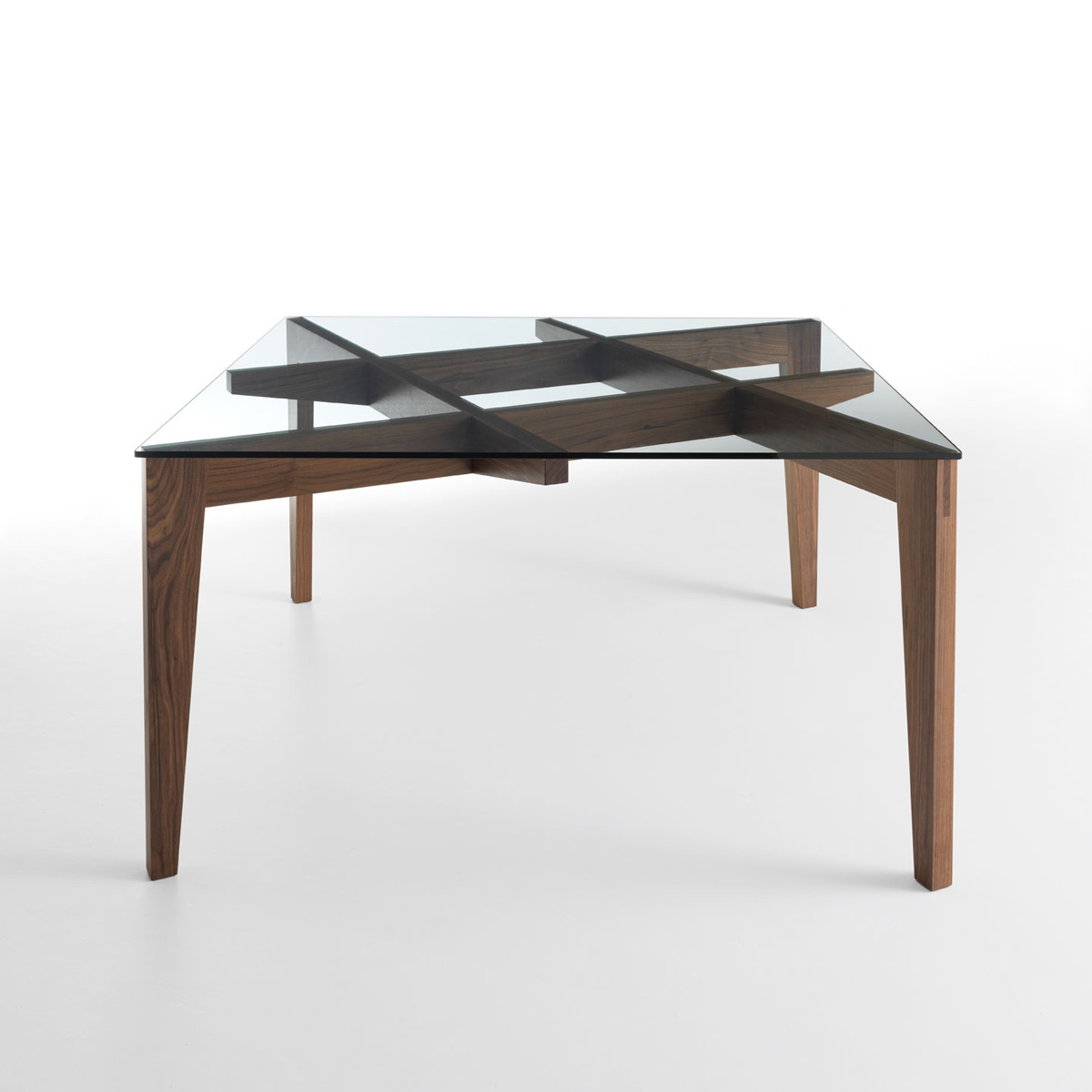 Horm AutoreggenteA great example of simple design and great materials, Autoreggente perfectly combines glass and wood the create a modern dining table oozing with style and sophistication. The legs are sculpted from solid walnut and have an interlocking design that provides strength and support in a contemporary furniture.   Click on the link below for more images and size details:   Autoreggente