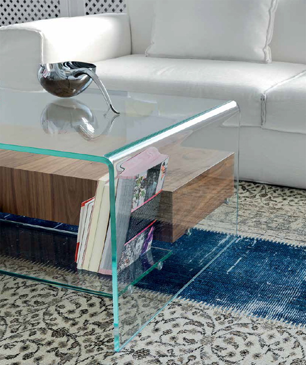 This new product from Sovet has a very clean contemporary look. The main body of the coffee table is bent glass with a central wooden drawer/shelf. The wider version of the two sizes also has a flat glass shelf alongside the wooden shelf/drawer.