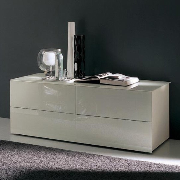 A dresser with 4 drawers and a painted wooden frame with matching glass panels on the drawers and top. Available in white, sand or anthracite (dark gray).