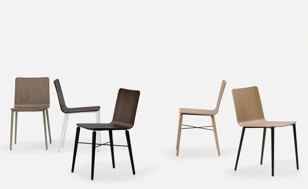 Chair with solid wood or metal frame. Shell in lacquered wood or veneer, with or without cushion quilted and upholstered.