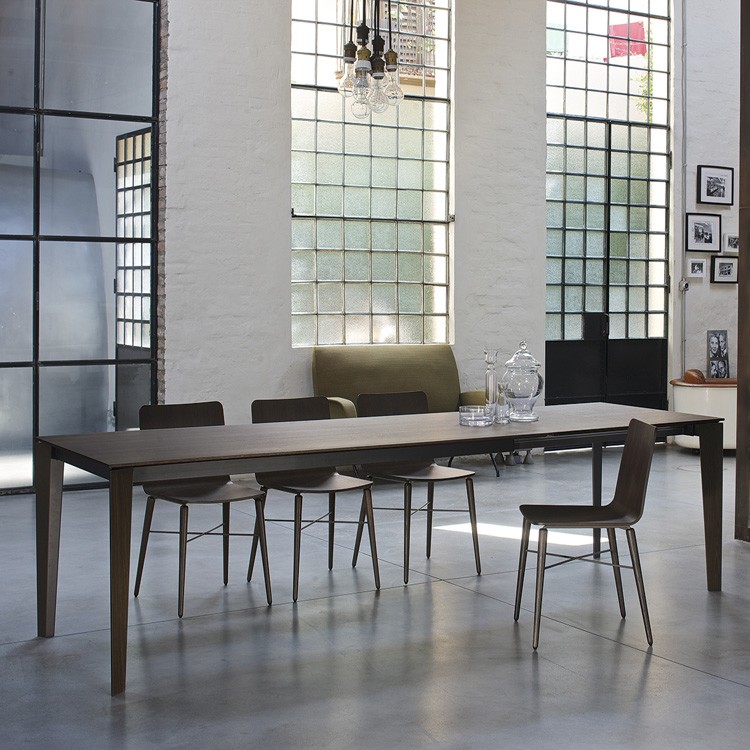 Senso is a great extending dining table for the modern home. The top, two extensions leaves and the outside leg details are all Spessart Oak veneer, the metal frame including the inside of the legs is finished in anthracite gray.