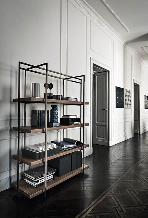 Bak Bookcase is a bookcase made of brushed painted steel structure with leather inserts, which refer to the style of the collection of the same name. The shelves, made of MDF, are covered with walnut veneer. The Bak collection consists of a dining table, coffee table, bench, bookshelf and valet stand whose minimum common denominator is an essential structure with a strong graphic and architectural sign. Bak is defined by a rectangular metal tubular shape, declined according to the type of furniture to which it gives life, covered and decorated with strips of thyme-colored leather except in the space near the conjunctions, where the metallic finish remains exposed creating a further detail that accentuates the geometry.