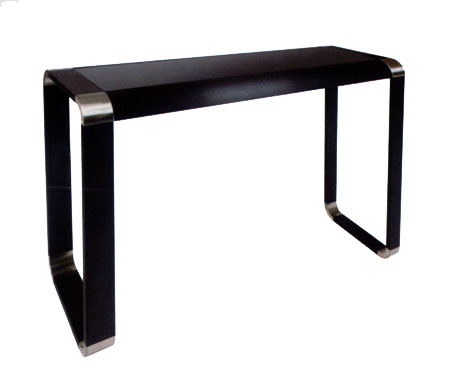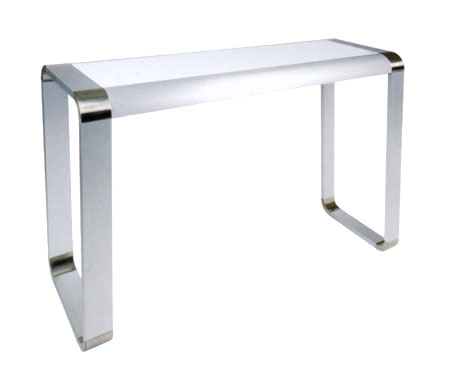 Futuristic console tables consisting of gentle curves and clean lines. The tempered glass top is available with a choice of black or white lacquer applied, and the frame is a combination of matt and chromed metal.