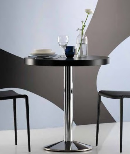 A modern dining table with a conical shaped steel base and steel central column, available with a brushed steel or chromed finish. The round top wood is 30mm thick with a laminate finish in black or white. Perfect for commercial environments, outdoor versions also available, see Contract Tables link below or call/email us for details.