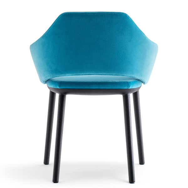 A comfortable and elegant upholstered armchair. The back is attached to the seat by the ends of the arms alone, with the resulting opening providing the armchair with a certain visual lightness and also making it easy to handle. The chair is well padded and covered in a wide choice of fabric, leather and simil leather (synthetic leather). The legs are solid ash wood available in various stains.
