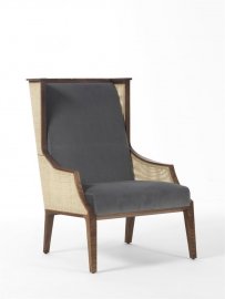 Easy chair with frame in solid canaletta walnut, cover in the fabrics of the collection and pulut cane woven arms. Solid natural maple insert in the upper part of the frame.