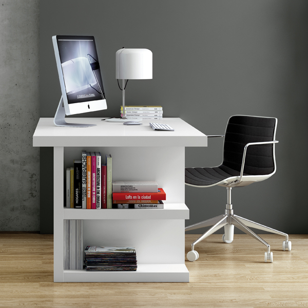 A flexible home office desk with a simple contemporary design, featuring legs with practical storage shelves. The top is available with various wood veneer finishes or a white lacquered finish, the legs are white.