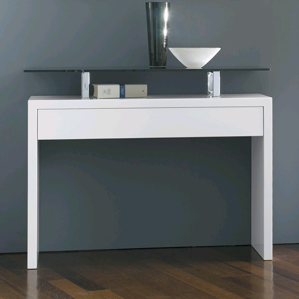 A stylish modern console table with a wooden frame, glass top, and integrated front drawer. The frame is available in wooden or lacquered finishes, the drawer is covered in hide leather, lacquered, or in the same wooden veneer to match the frame. Glass top is in extra clear, smoked, matt, or shining painted glass.