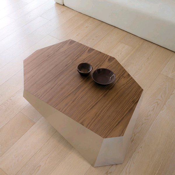 A stunning geometric coffee table available in 2 versions: with satin aluminum sides and a wooden top, or completely lacquered in a range of colors.
