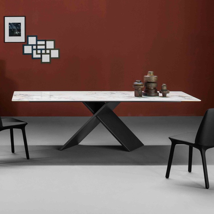 A great modern dining table featuring a calcatta marble top and a criss crossed metal base. The base forms a strong silhouette and is available in a variety of painted colors. The calacatta marble top is 14mm (half an inch) thick. A version with a wooden top is also available, see related products below.