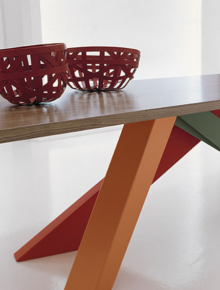 An ultra-stylish extending dining table that, due to its angled legs, looks different from each side. Available with a wooden top (walnut, oak or white lacquered finish), a 15mm thick glass top (white or black, acid-treated for a textured finish). The 4 angular steel legs are laser cut and available in 4 color schemes: all anthracite gray, all white, coral red-orange-green-lilac, or powder pink-brown-dove gray-amaranth. A ceramic top is also available on request.