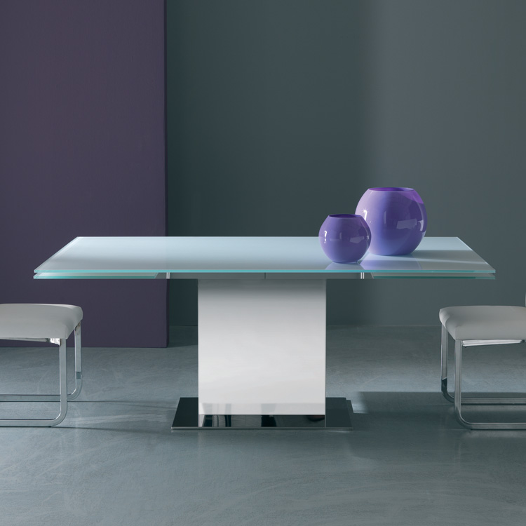 An extending dining table that combines clean lines and the highest quality materials to give a futuristic, ultra modern look to the dining room. The table top and extension leaves are lacquered in a range of colors. Stainless steel column with a steel finish or lacquered in white or brown. Stainless steel base. THIS PRODUCT IS DISCONTINUED.