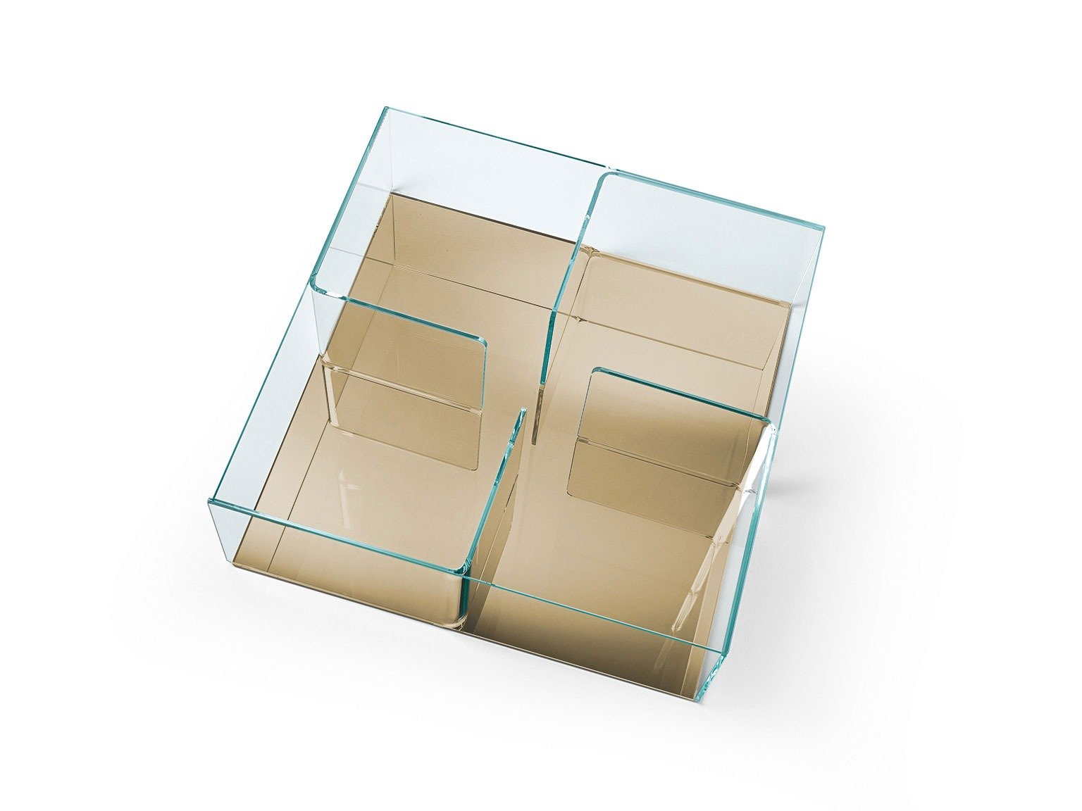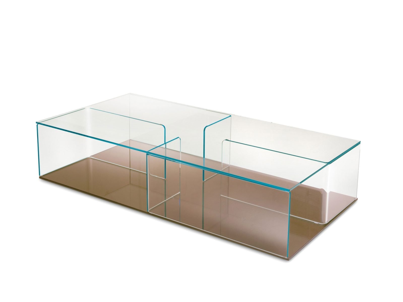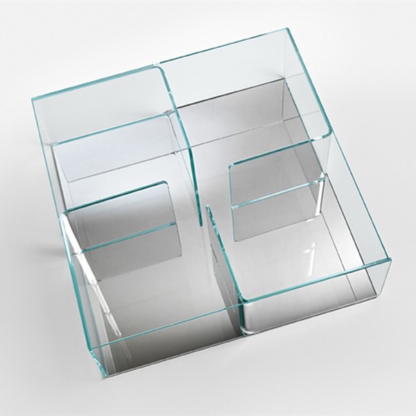 A stunning coffee table with ample storage space. The table is composed of 4 curved glass elements sandwiched between 2 sheets of glass. The curved parts divide the table into storage sections. The top and curved parts are in 10mm thick extra clear glass - the base is available in extra clear, lacquered or mirrored glass.
