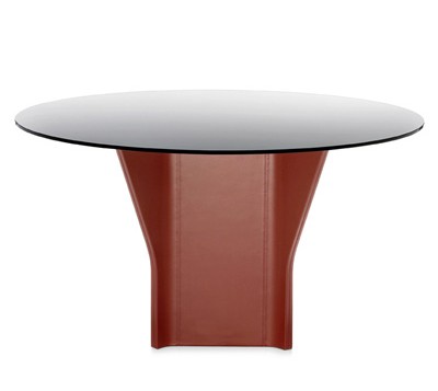 A unique modern dining table consisting of a sturdy steel base covered in leather, and a round tempered black glass top. See '02 Leather' color chart below for available base colors). Also available with an oval top, see related products below. THIS PRODUCT IS DISCONTINUED.