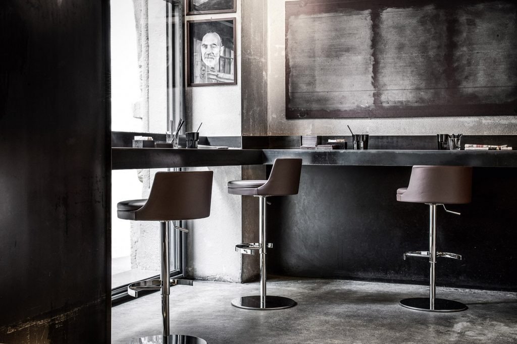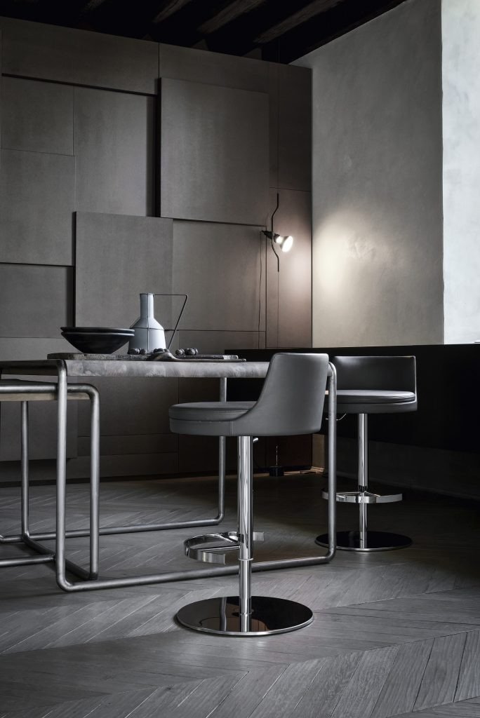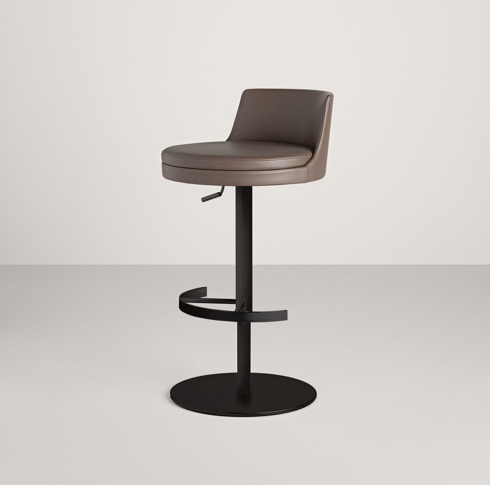 A fun modern stool with adjustable height and a retro design influence. Upholstered in fabric or leather with a chromed base, stem and footrest. Various fabric, soft leather and leatherette colors available, see corresponding color charts below.