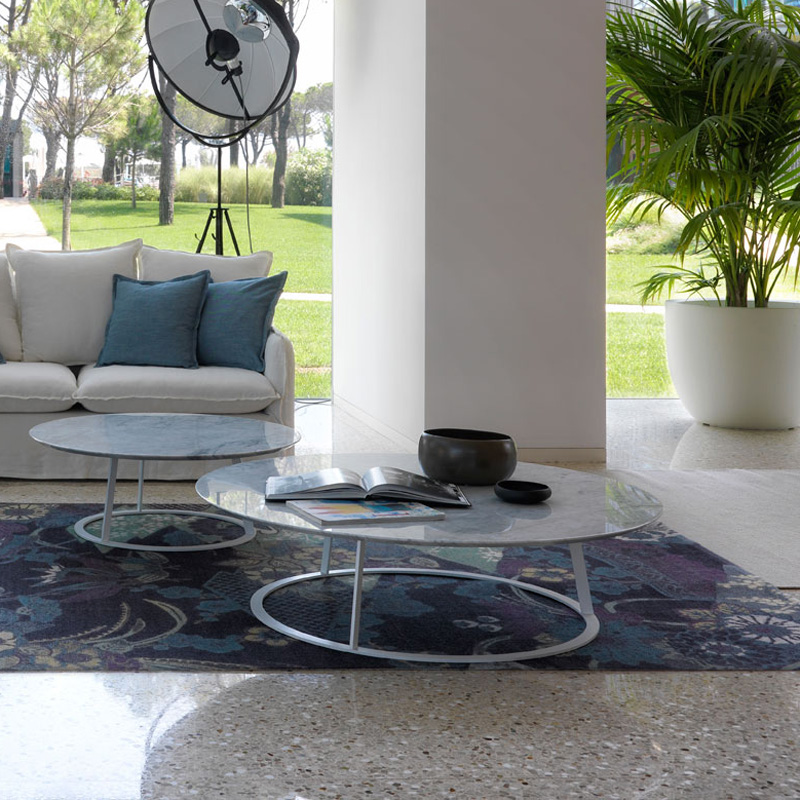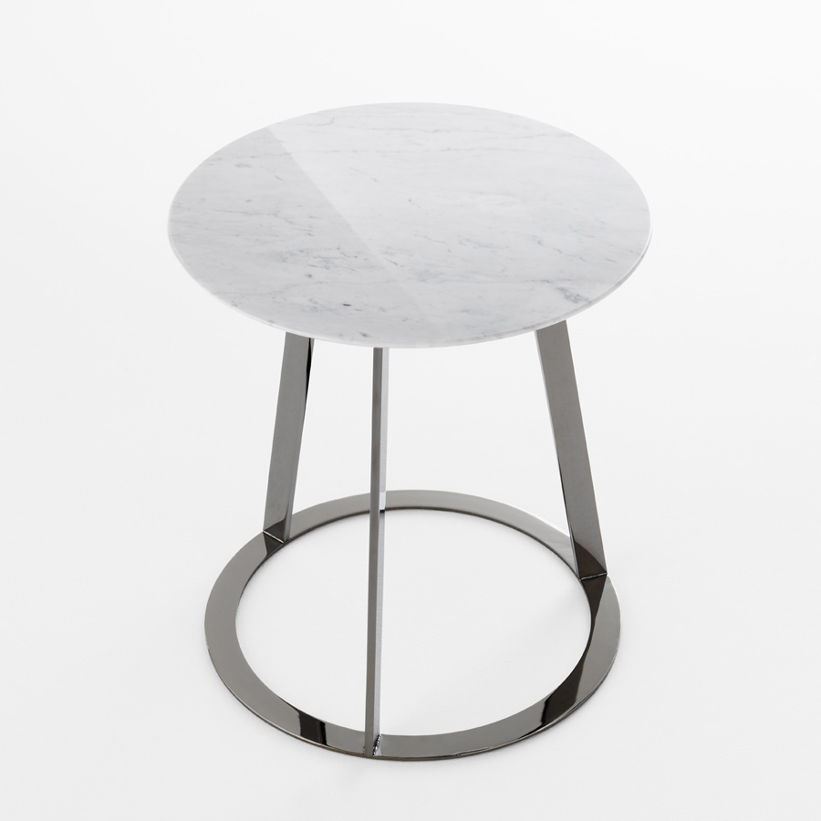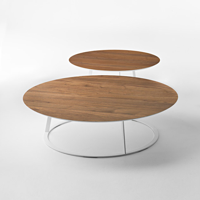 A highly contemporary family of end tables and coffeec tables. The base is made from painted metal (white or black) with a choice of marble tops, lacquered MDF tops, or a veneered walnut top.
