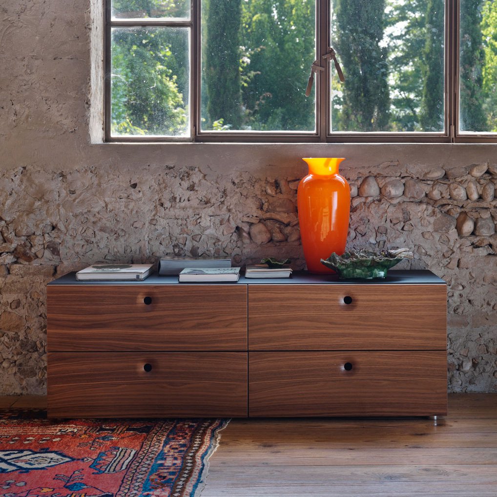 The Anish chest of drawers/cabinet collection feature drawers where the lack of a traditional handle simplifies the frontal appearance. This detail naturally becomes the focus of attention, as an invitation to reveal the contents.