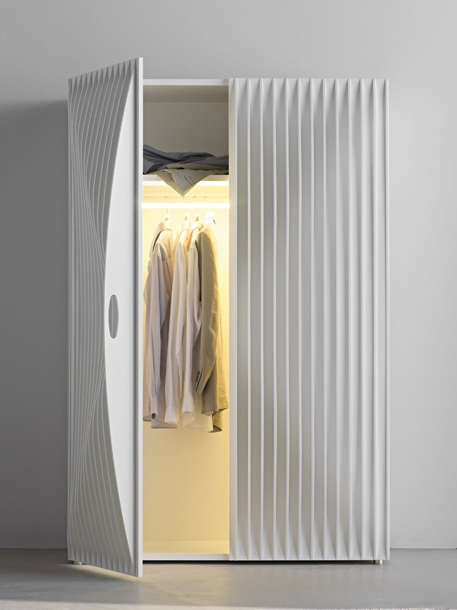 Blend is a closet featuring doors with evenly-spaced, thin sheets of MDF, which together create a dynamic effect. Designed by Karim Rashid. Available with internal shelves or a horizontal bar for hanging clothes. Structure and doors lacquered in a wide range of colors. This product also includes an internal LED light with sensor.