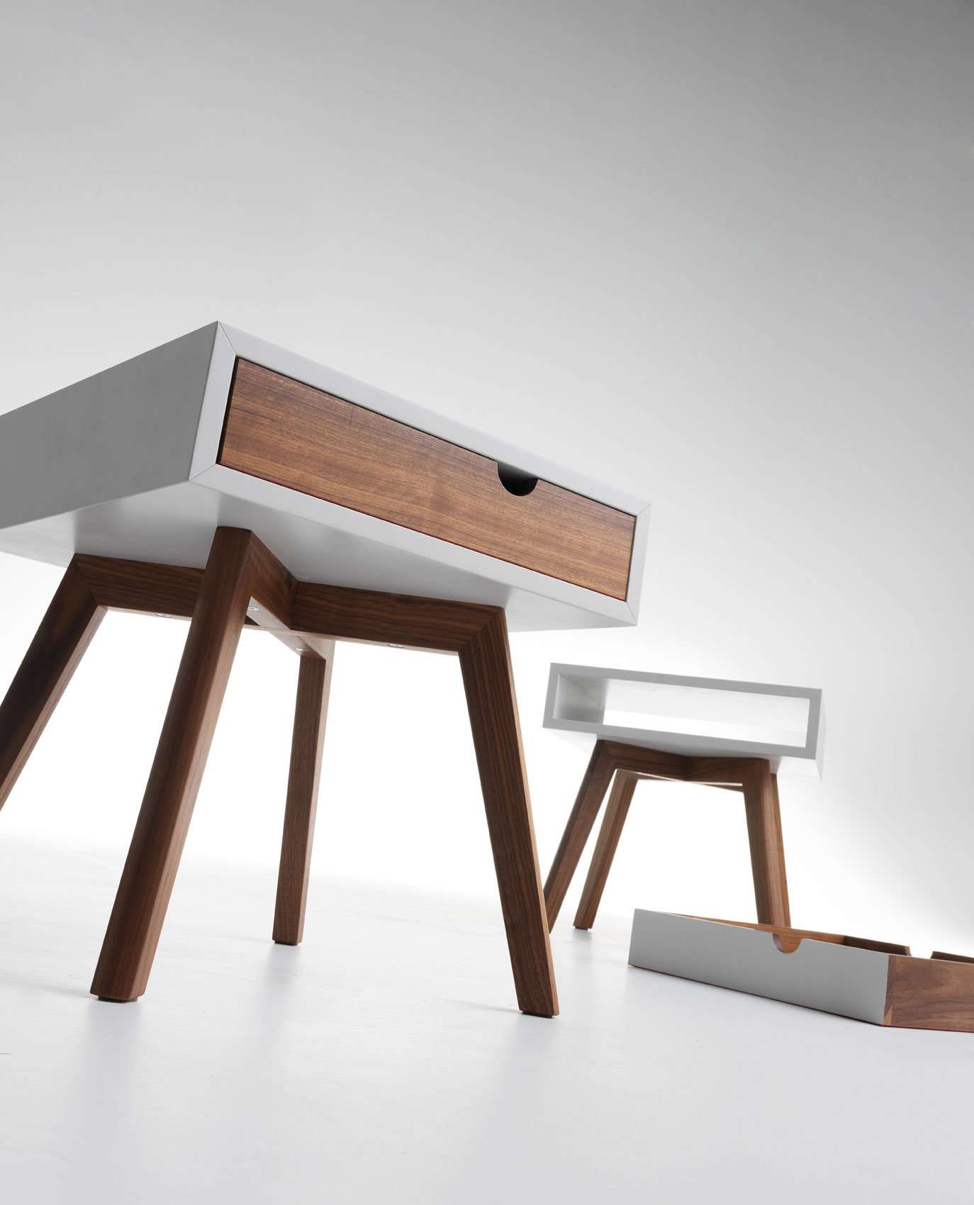 This bedside table/nightstand has legs in solid black walnut. The main structure is lacquered in a choice of colors, the drawer is walnut-veneered MDF with one walnut drawer front and the other front lacquered to match the main structure. The inside of the drawer is always white.