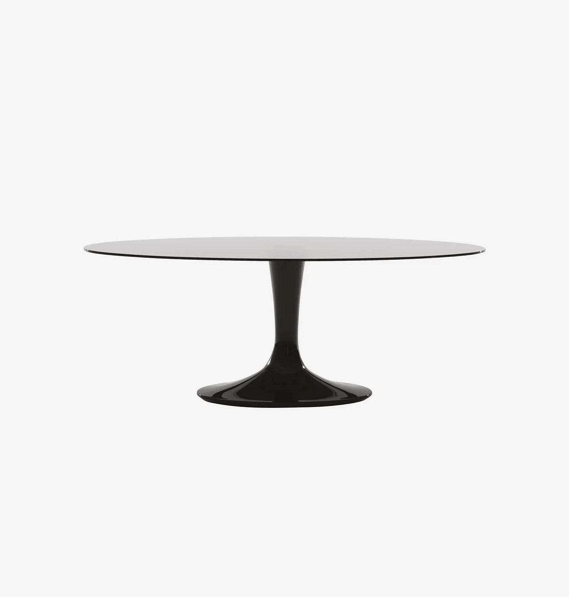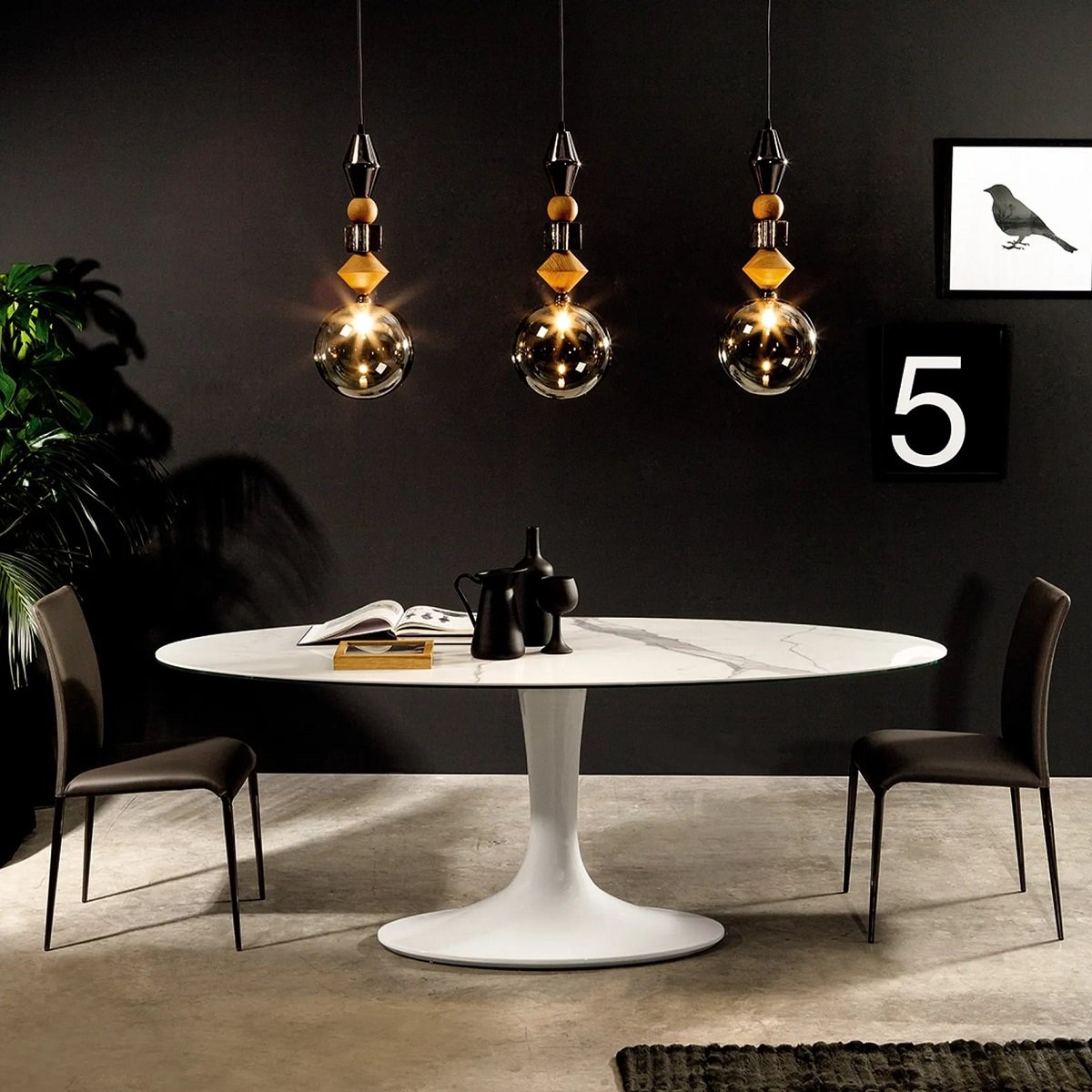 Imperial's elegant base supports an oval glass top. Priced as shown here with a shiny white base and statuary marble effect porcelain and glass. The base is also available in shiny black, glossy gun metal, or shiny champagne. Top is available in transparent, smoked gray, extra clear transparent, or extra clear white lacquered glass; or porcelain and glass. Please contact us for pricing on options other than that priced here.