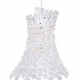 Suspension light composed of a polycarbonate tubular framework entirely encrusted with tiny transparent polycarbonate flowers. The result is an industrially produced lamp with the form and stylistic complexities of a unique hand-made lamp. There are 4 color options: transparent, transparent pink and black mix, opaque white and opaque black. 3 bulbs positioned along the internal framework diffuse beams of light through the petals and reflects off their faceted surfaces.