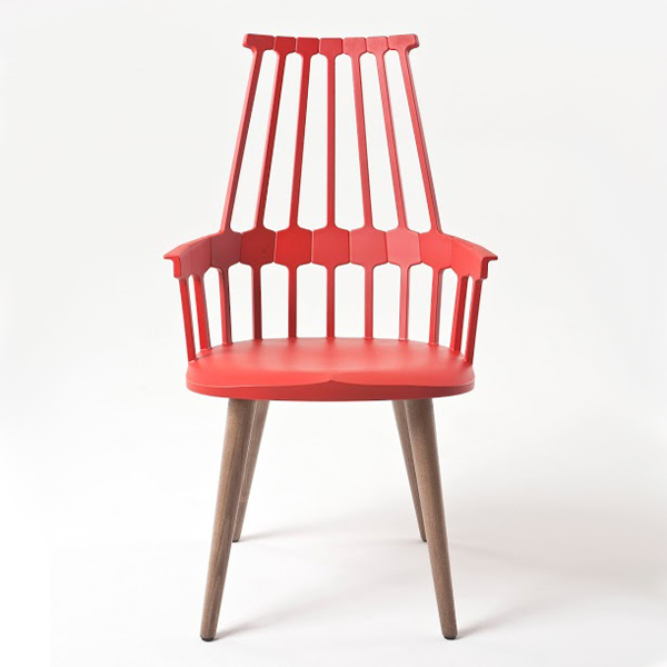 Kartell revisits an old classic by reinventing the Windsor chair in single-piece moulded technopolymer. Inspired by the Anglo-Saxon past of England, this roomy armchair provides generous suport and a distictive style. This version has 4 solid ash wood legs, lacquered black or white to match the seat or with an oak stain. See related products below for alternative leg styles.