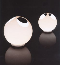 Ceiling lamp made of a white acrylic sphere with three elliptical laser cut holes and chromed metal structure. THIS PRODUCT IS DISCONTINUED.
