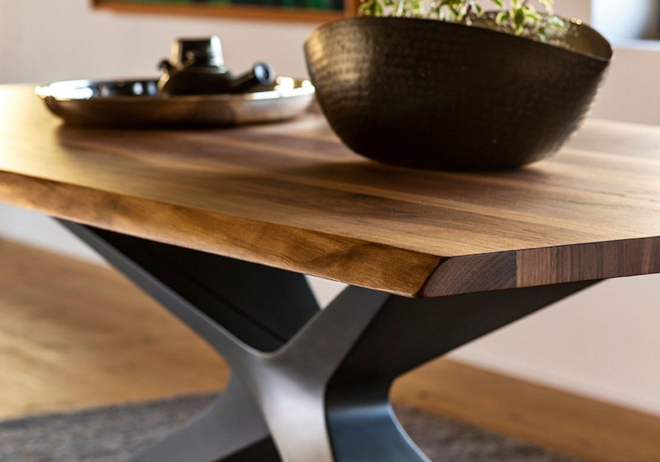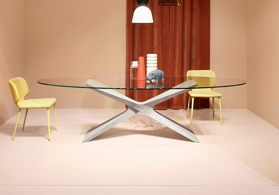 Created by Andrea Lucatello for the Midj brand, the Nexus dining table is an eye-catching statement piece for any dining room. In addition to being stylish, the strong and scratch-resistant Baydur is available in faux concrete finish and holds up the spacious glass, crystal ceramic or wooden tops with ease.