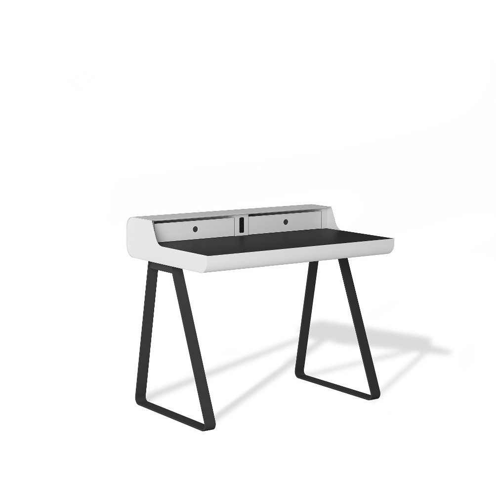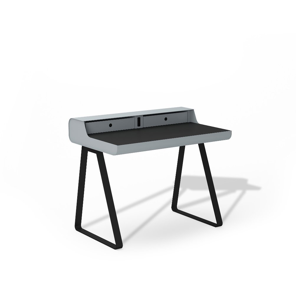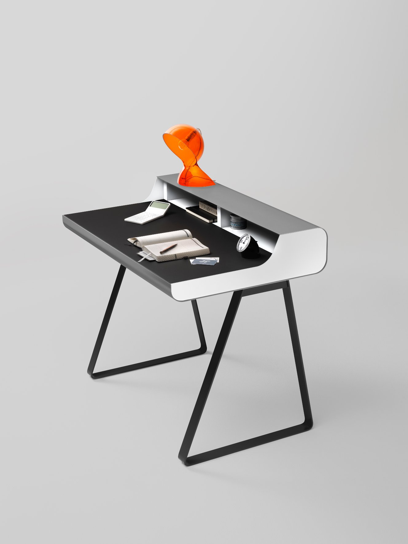 An open version of the PS08 offering a larger working area, central bar with brush for cable routing and spacious drawer with pencil groove. The work surface is black linoleum. Available on skids or on legs. The body has a semi-matt finish, as standard the feet are lacquered black in a special scratch and abrasion proof matt paint. The 2 drawers are available as an option, as is 2 tone color, contact us for a specific quote.
