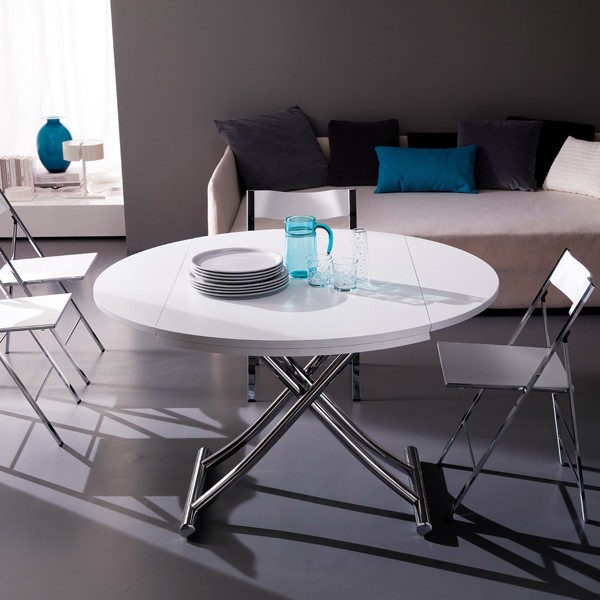 A clever space saving table that transforms from a rectangular coffee table with rounded ends into a round dining table. A gas lift mechanism raises the table and side extension leaves fold out alongside the top. Table top and leaves available in melamine or wood finishes. Chromed metal structure. Adjusts to any height in between the minimum and maximum.
