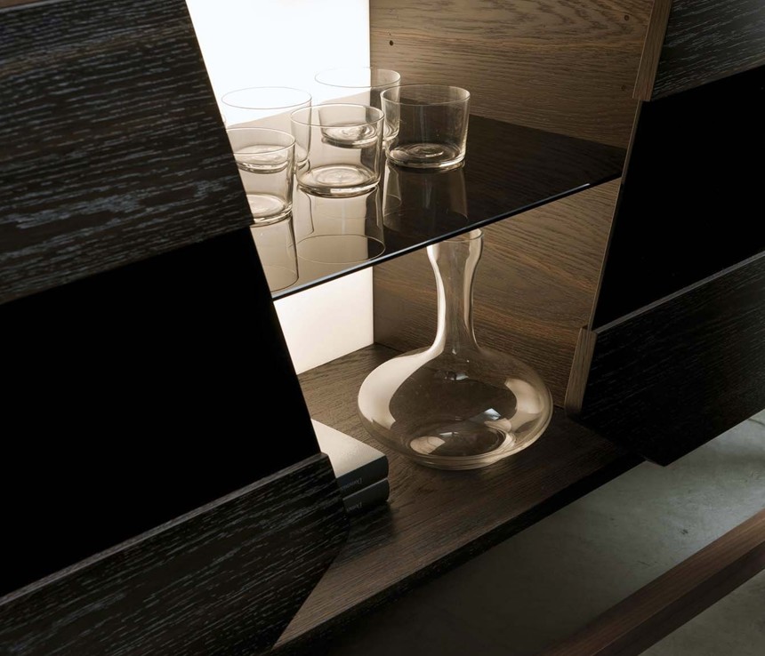 A luxurious drinks cabinet made from beautiful solid walnut and smoked oak. Black glass shelf and door panels. The unit behind the doors in covered in mirror and the open storage area is lit from above. An optional smoked oak tray for the top of the cabinet available on request.