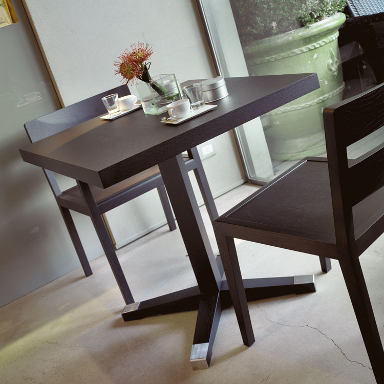 Square dining table in ash wood, available in a number of wood stains, or lacquered in various colors, in a way where the wood grain is still visible. Stainless steel feet.