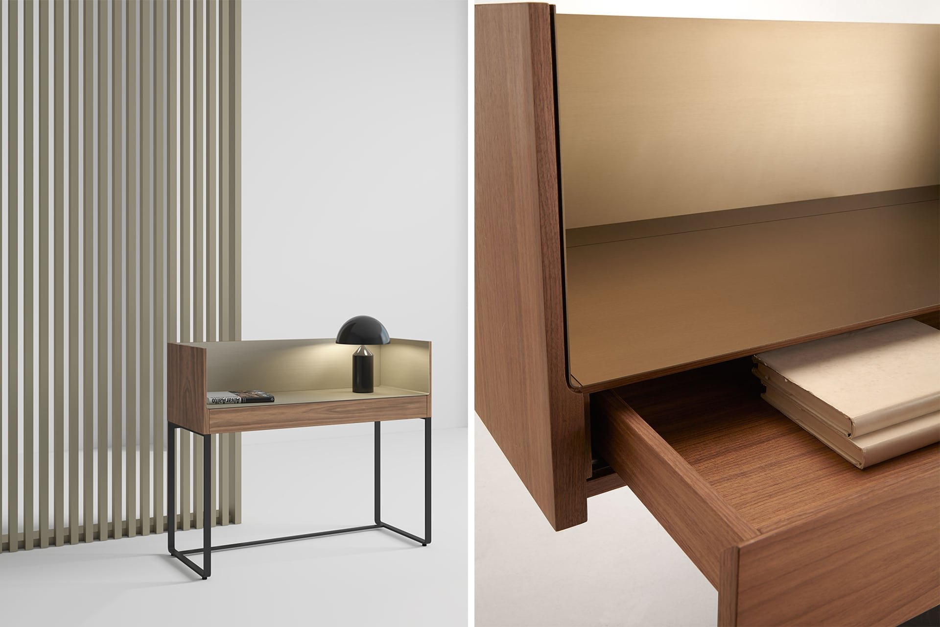 Part of a collection of sideboards, chests of drawers, and TV benches designed by Mario Ruiz for Punt in 2012, the Stockholm desk is a simple yet impressive piece. The stunning top surface is accented with an aluminum finish in gold, pale rose or bronze. Its metallic key element is further enhanced by its wooden interior and exterior panels that are finished in stained ebony, dark gray or sienna gray, or matt lacquered delicate layers of oak or walnut. Winner of the Red Dot 2015 Award, the Stockholm desk is an elegant piece of furniture with adjustable metal legs that can be leaned on a plinth,or hung from optional wall-fixing devices. Contemporary and tasteful, the Stockholm desk is the perfect statement piece to any room.