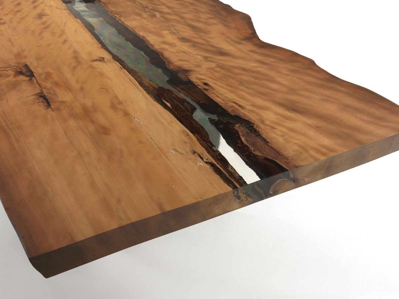 Table made with top in solid Kauri, ancient wood of New Zealand and geometric base in iron with visible welding.Finish: base of oil / natural wax of vegetable origin with pine extracts. Every buyer has the chance to choose his or her very own table and whether the top is filled in with resin, where possible.