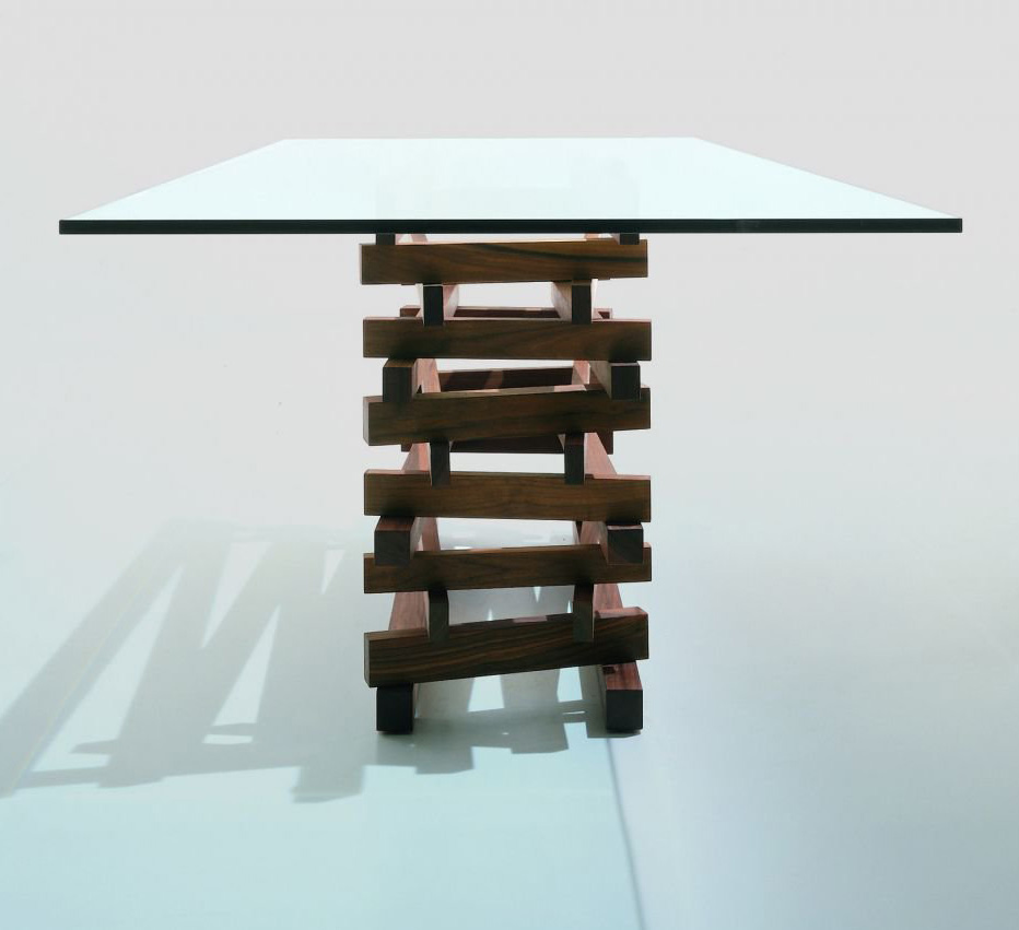 Table with top in transparent glass, combined with a leg made up of overlaid and stacked strips in solid wood.Finish: base of oil / natural wax of vegetable origin with pine extracts. THIS PRODUCT HAS BEEN DISCONTINUED.
