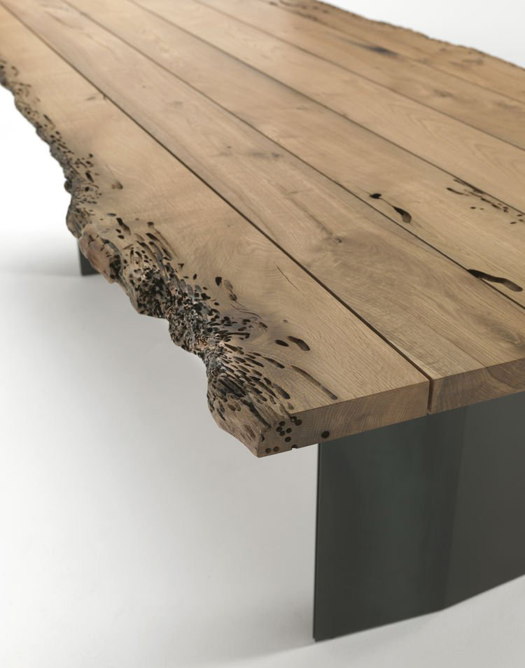 Table with top made of solid Briccola wood, disused poles from the Venetian Lagoon, characterized by boards placed side by side with natural edges. The base consists of iron legs characterized by semi-folded double sheet metal in the shape of a rhombus.Finish: base of oil / natural wax of vegetable origin with pine extracts.