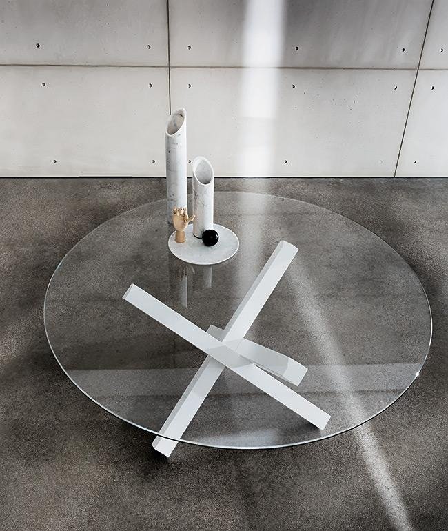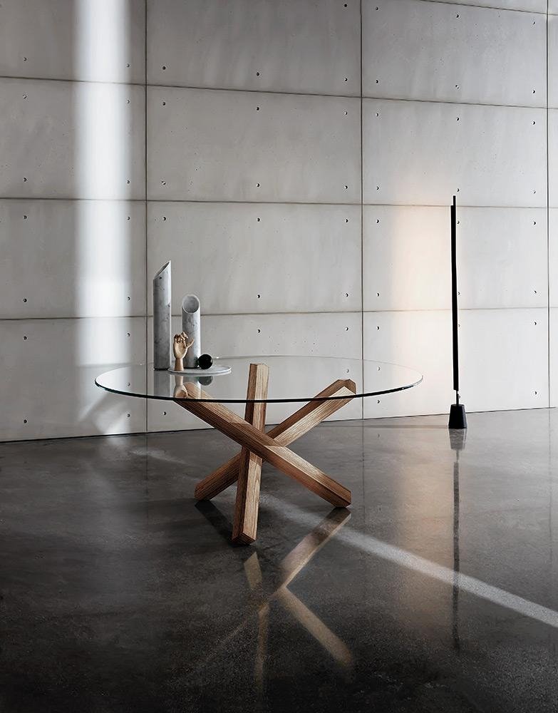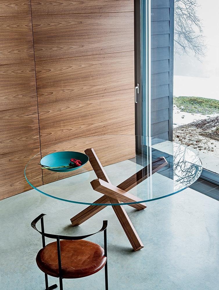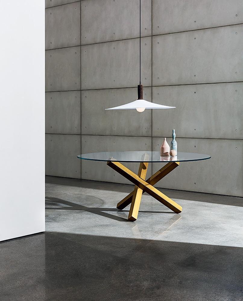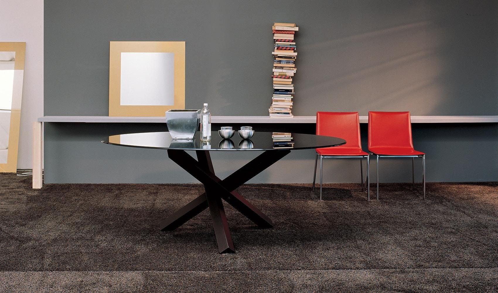 An ultra-modern dining table with a round glass top (12mm thick) and a veneered wood or chromed metal base. The glass table top can be extra clear or lacquered in a variety of colors (see color chart below). Elliptical version also available, see related products below.