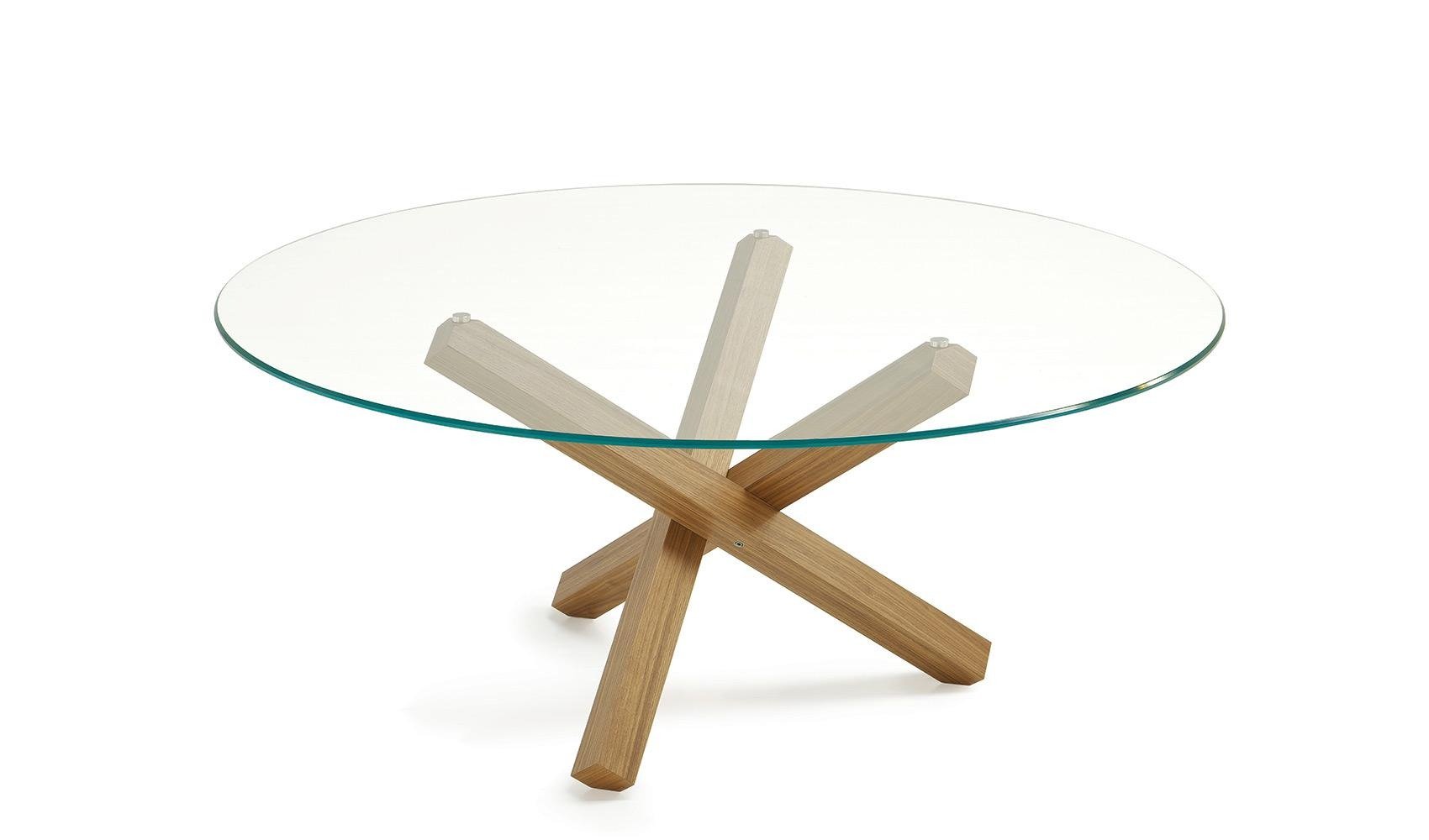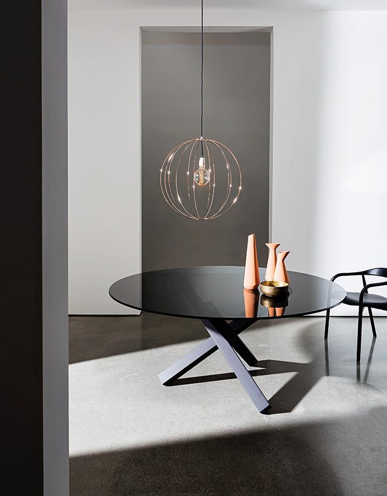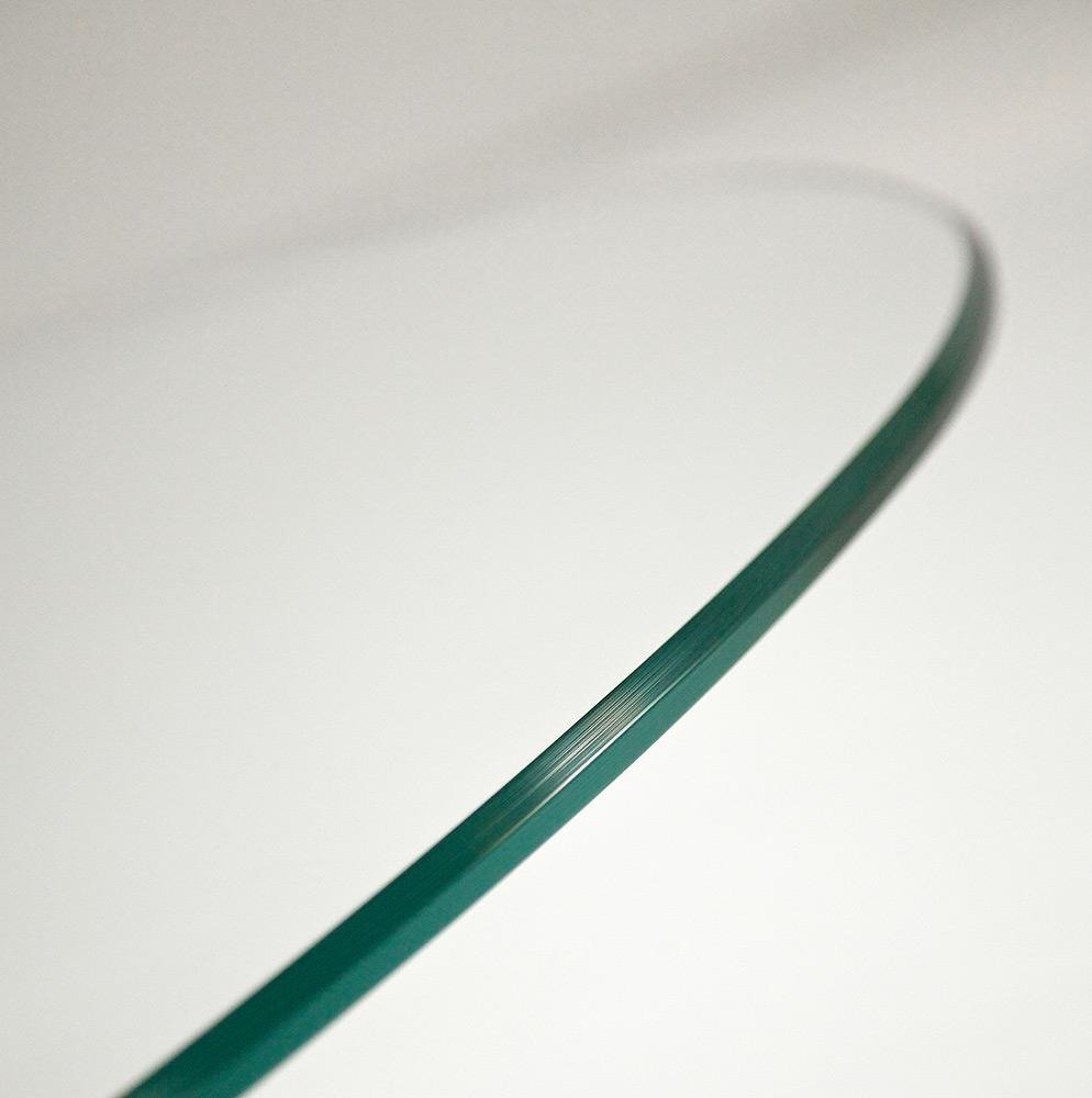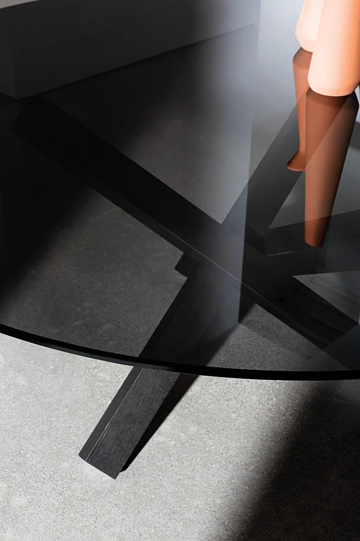 An ultra-modern dining table with a round glass top (12mm thick) and a veneered wood or chromed metal base. The glass table top can be extra clear or lacquered in a variety of colors (see color chart below). Elliptical version also available, see related products below.