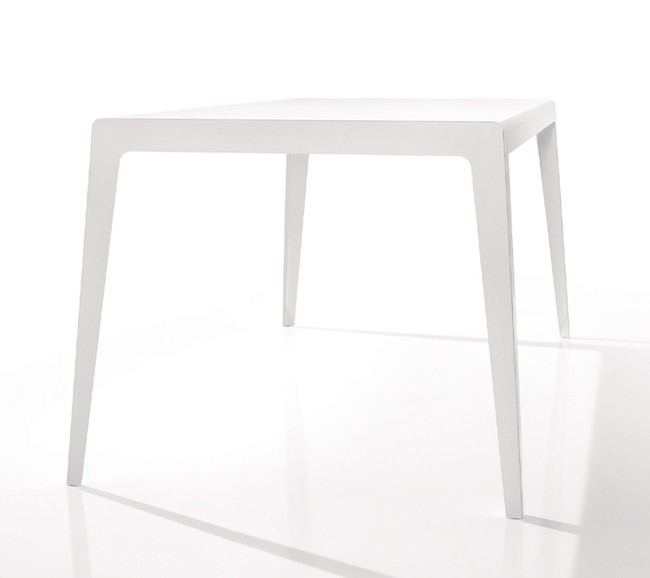 A sleek metal dining table with curved edges and tapered legs. Available in white or coffee.