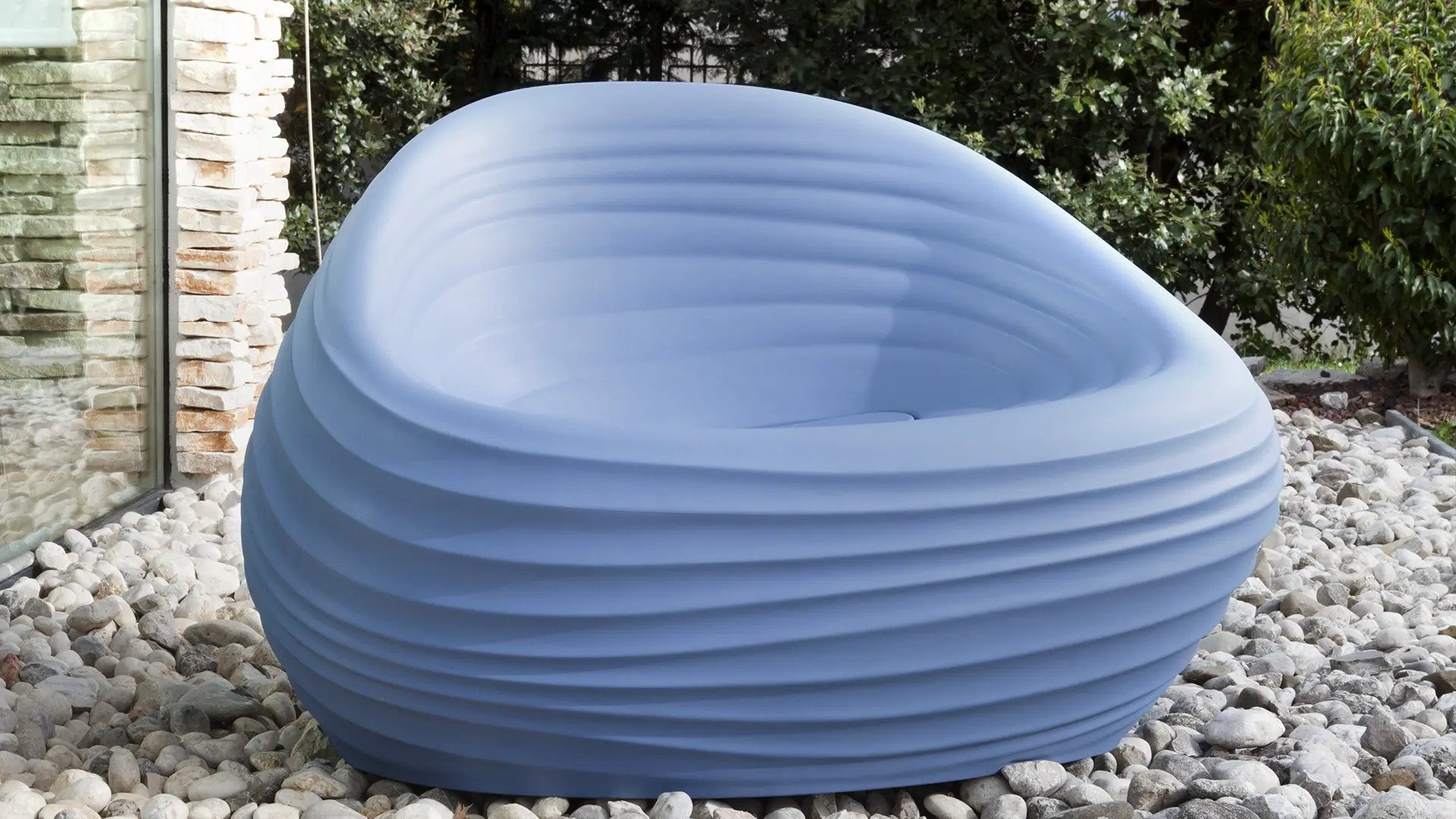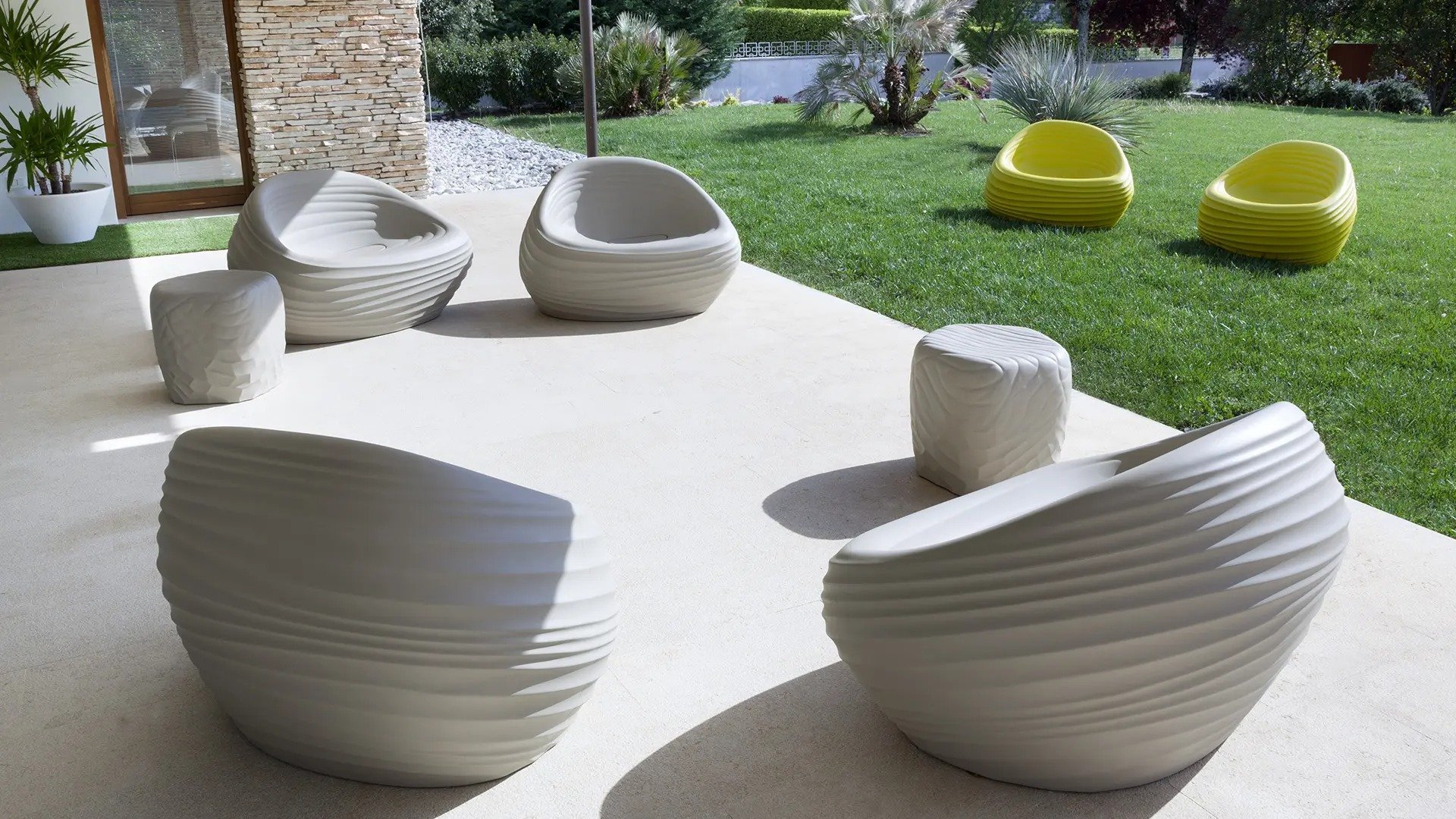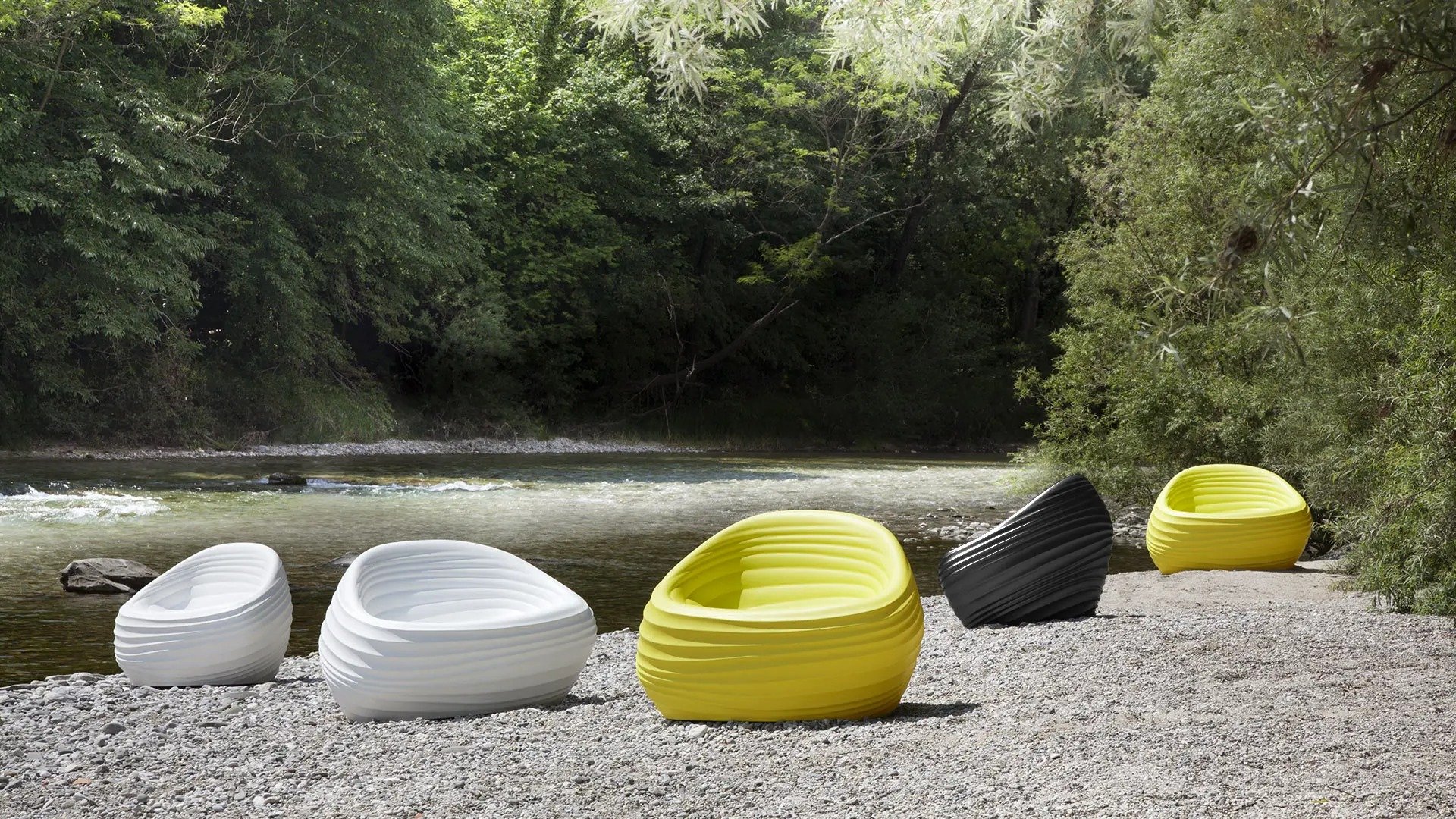 This modern lounge chair offers softness and comfort, it is very easy to move and is waterproof. The material soft touch plus is a bi-component molded polyurethane. The product obtained in the mould is formed by a core in soft, flexible polyurethane and an external polyurethane skin, colored, compact and elastic. The material is extremely resistant and fire retardant. Available in various colors and suitable for outdoor use.