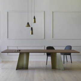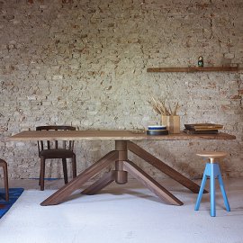 A new modern dining table from Miniforms featuring an imposing wooden base consisting of 3 wooden beams that intricately dissect each other. A very masc....